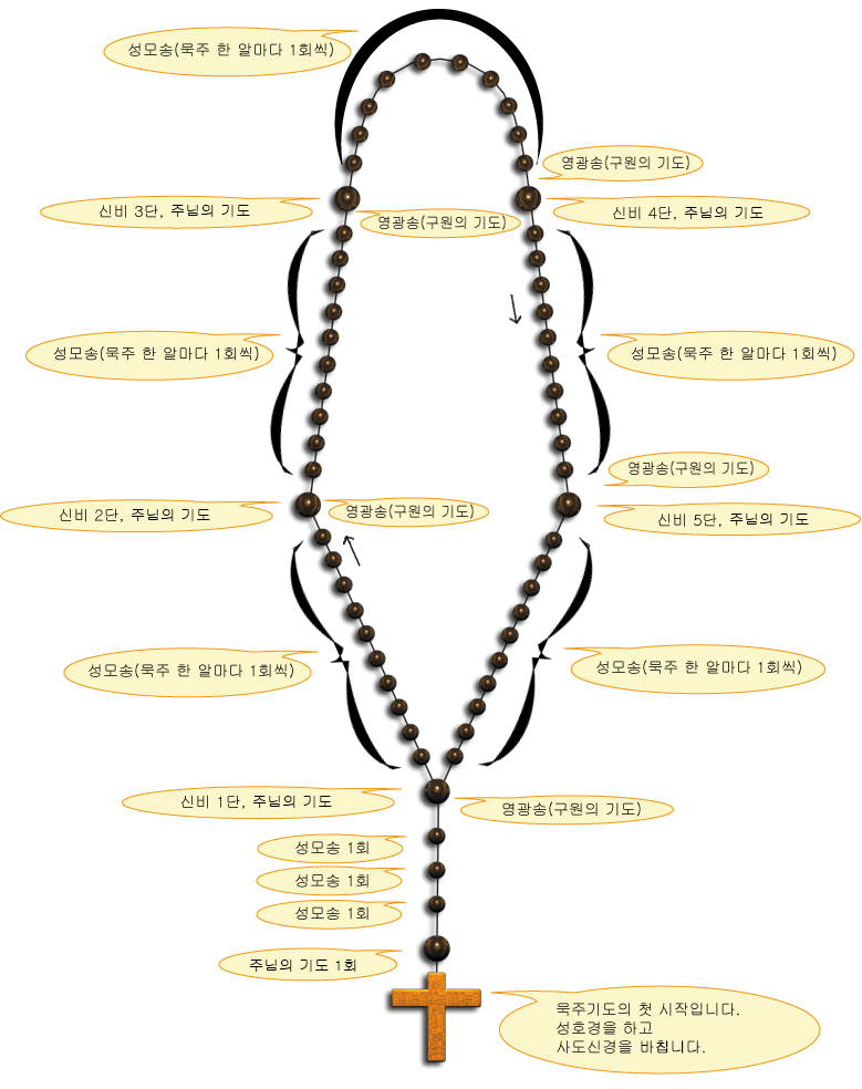 ※ 묵주기도 요일 배분은 교황 요한 바오로 2세 성하의 교서 『동정 마리아의 묵주기도(ROSARIUM VIRGINIS MARIAE)』,p47 를 참조하였습니다.